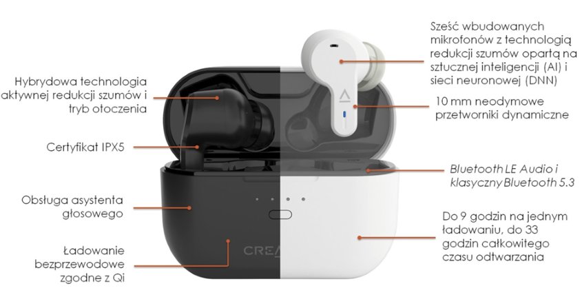Creative Zen Air Pro to zestaw słuchawkowy typu TWS, który został zaprojektowany przez inżynierów z Creative Technology by towarzyszyć w codziennych obowiązkach, jednocześnie cieszyć bardzo dobrą jakością dźwięku. Słuchawki zostały wyposażone w nowoczesną technologię LE Audio, zestaw kodeków LC3+ (ULL), LC3, AAC, SBC, dynamiczne przetworniki 10 mm, hybrydową aktywną redukcję szumów (ANC) z trybem otoczenia, Bluetooth 5.3, aplikacja Creative a także wydłużony czas pracy baterii i ładowanie bezprzewodowe zgodne z QI.